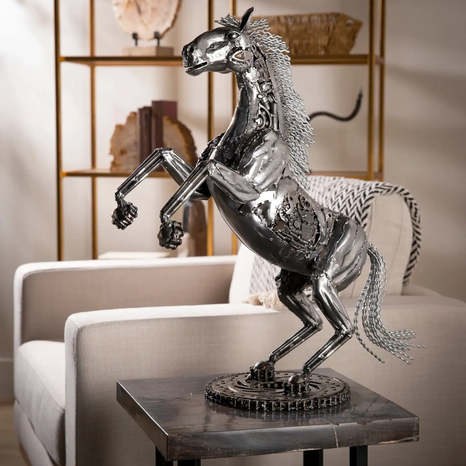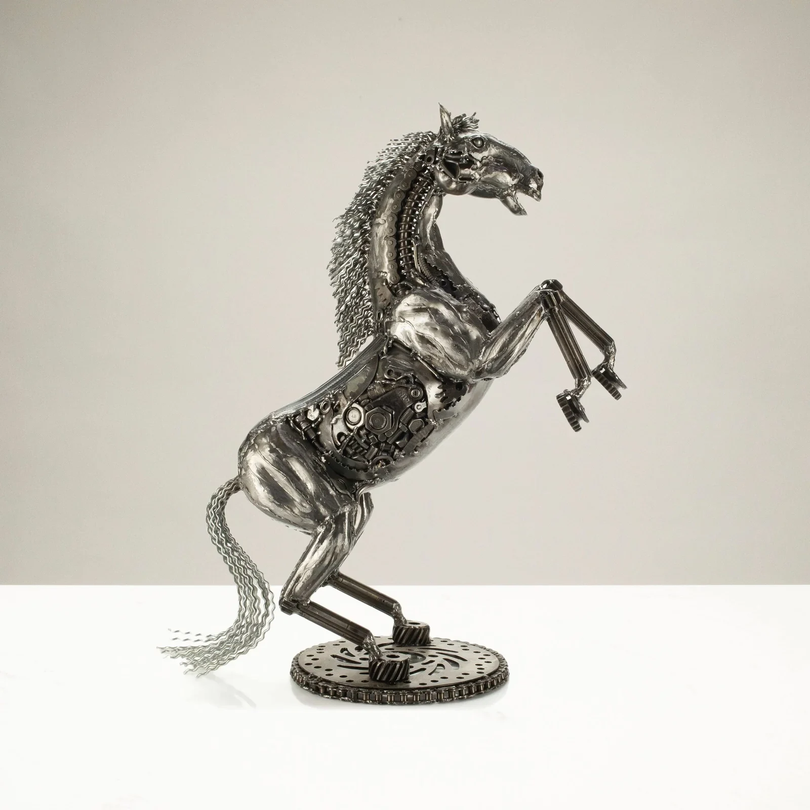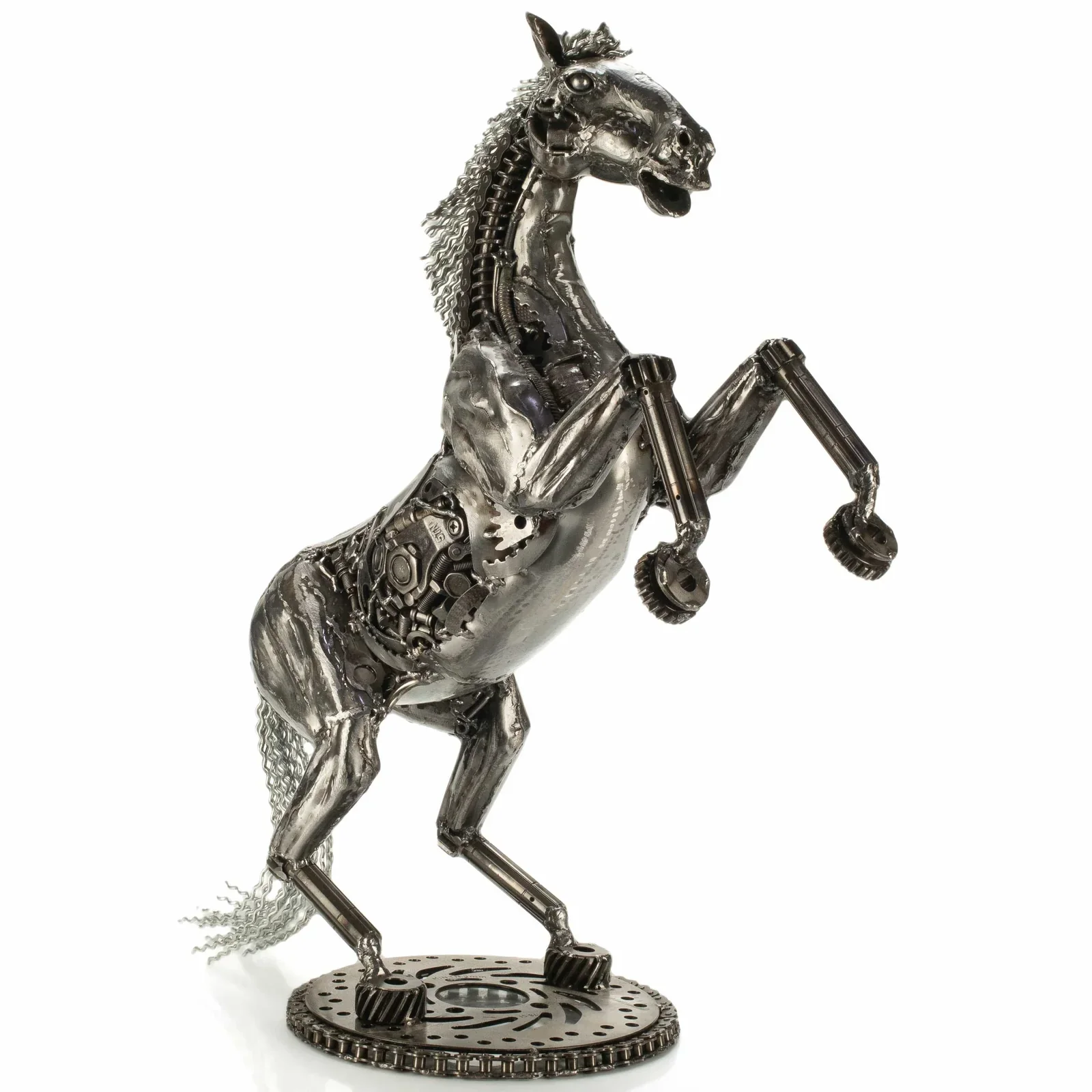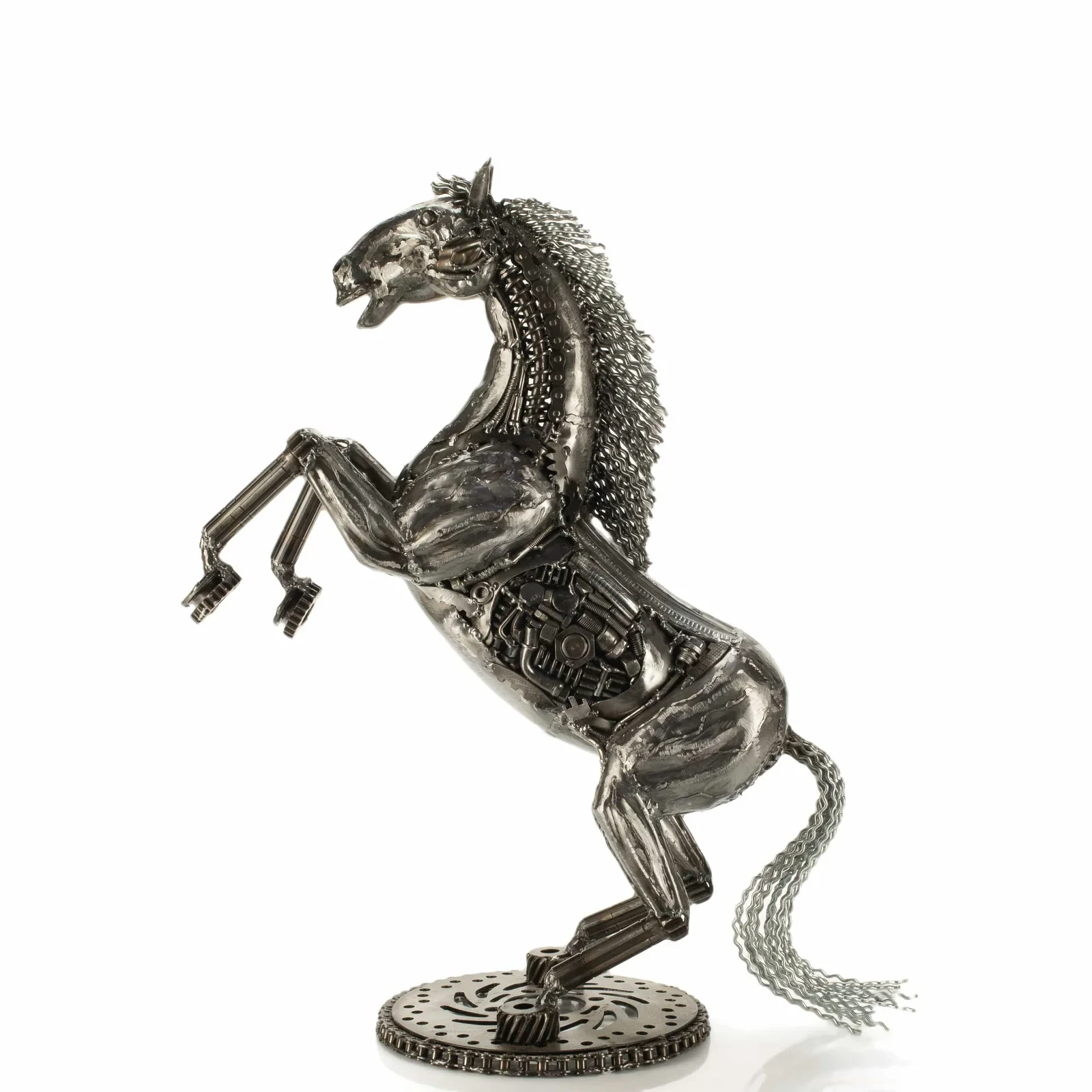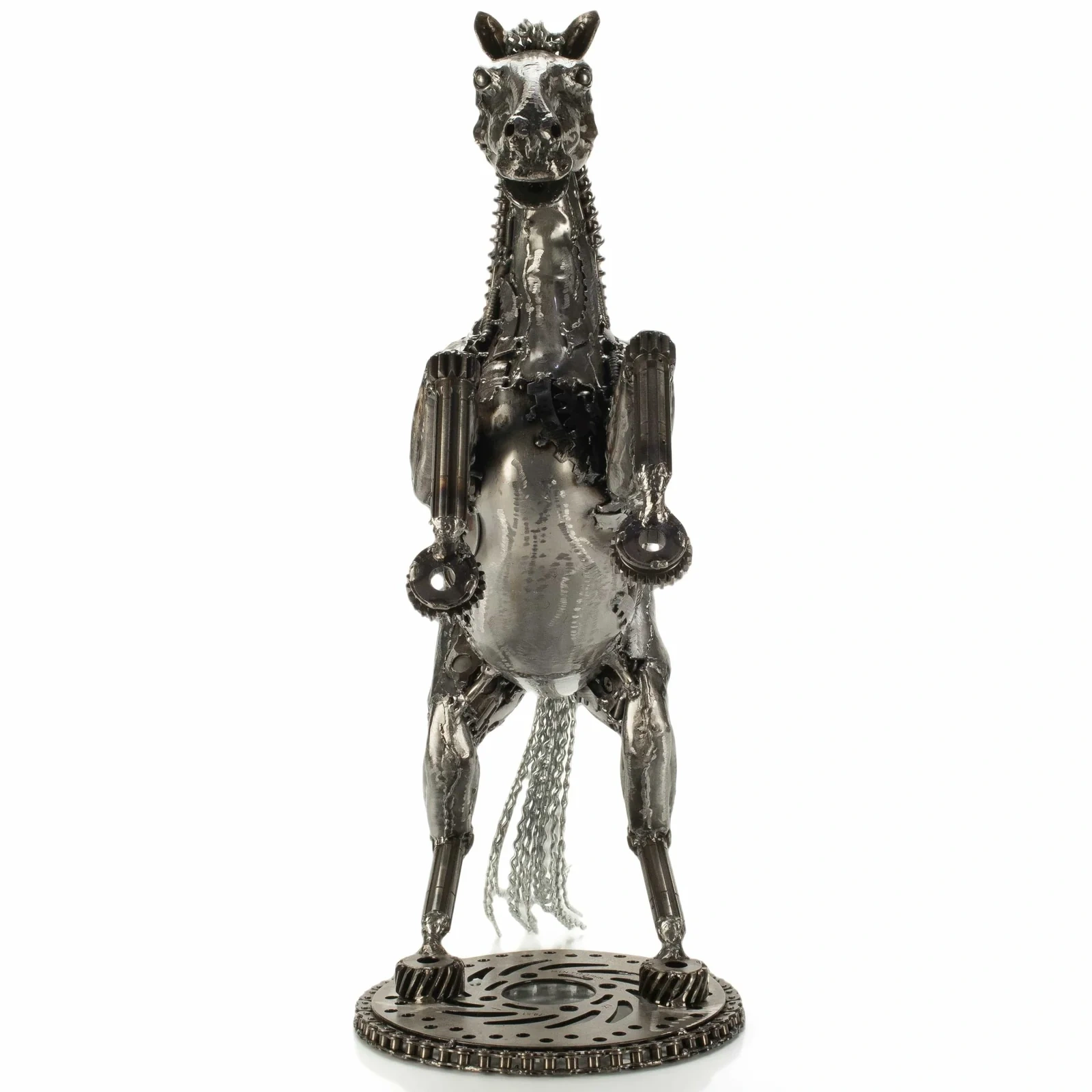 This is a KALIFANO original, hand-made work of art. This 21" Jumping Horse sculpture is an amazing and unique piece inspired by a jumping horse, sure to make a statement wherever it is placed. Handcrafted and welded from dozens of recycled car, motorcycle, and moped parts fused together by master welders, this piece is a stunning accessory or gift for anyone who appreciates one-of-a-kind art.