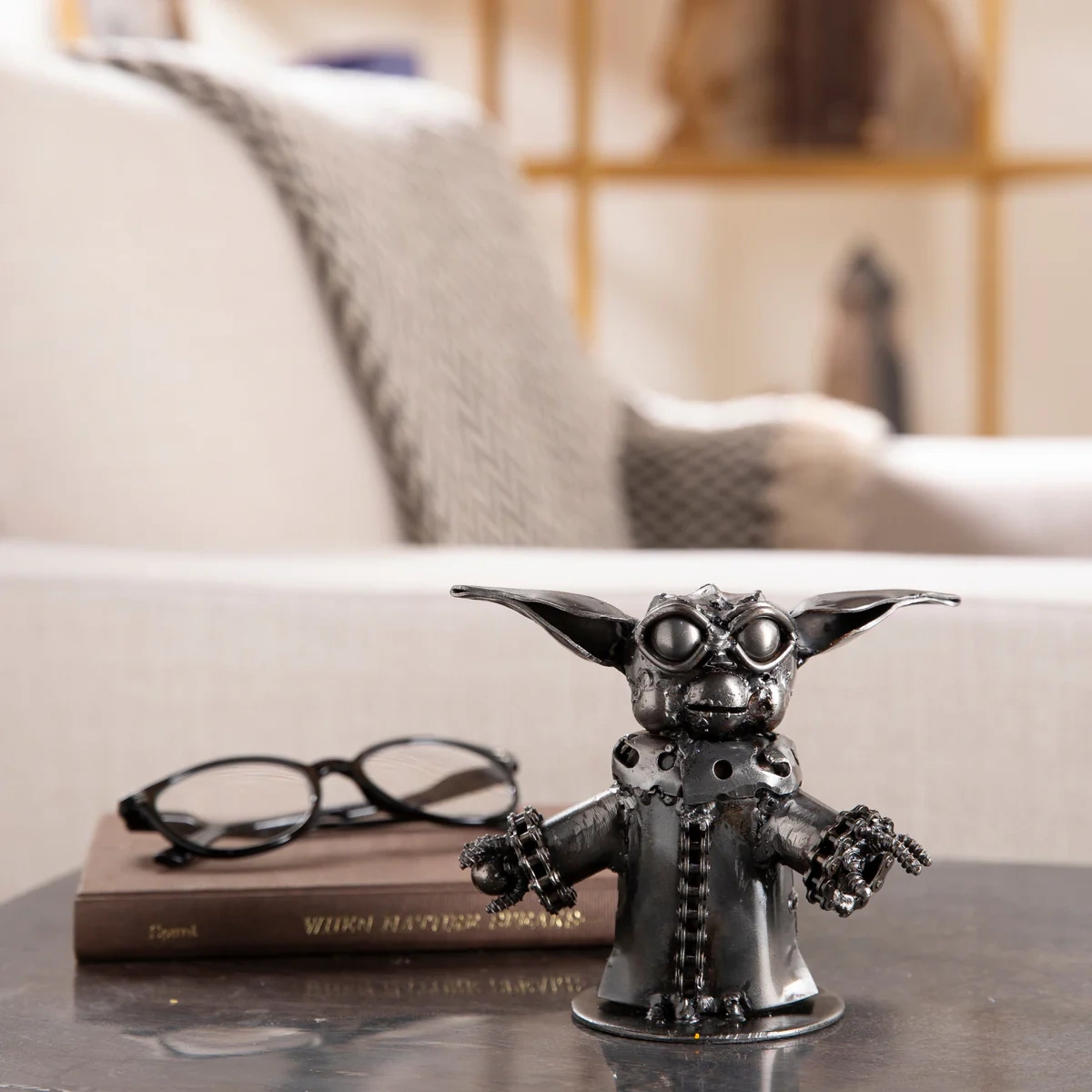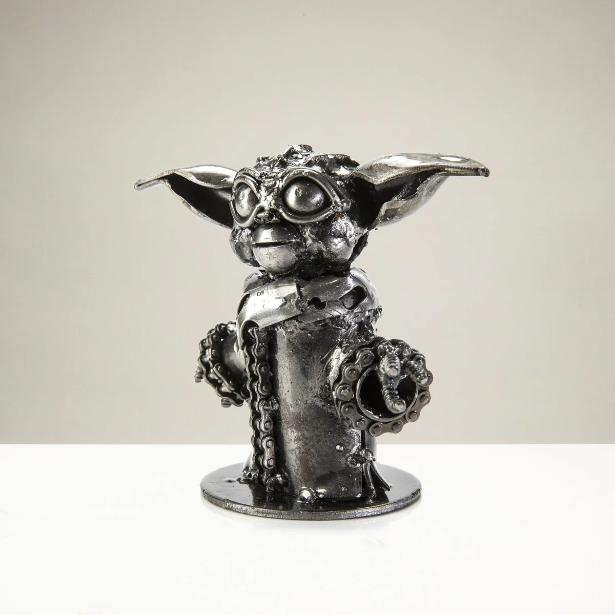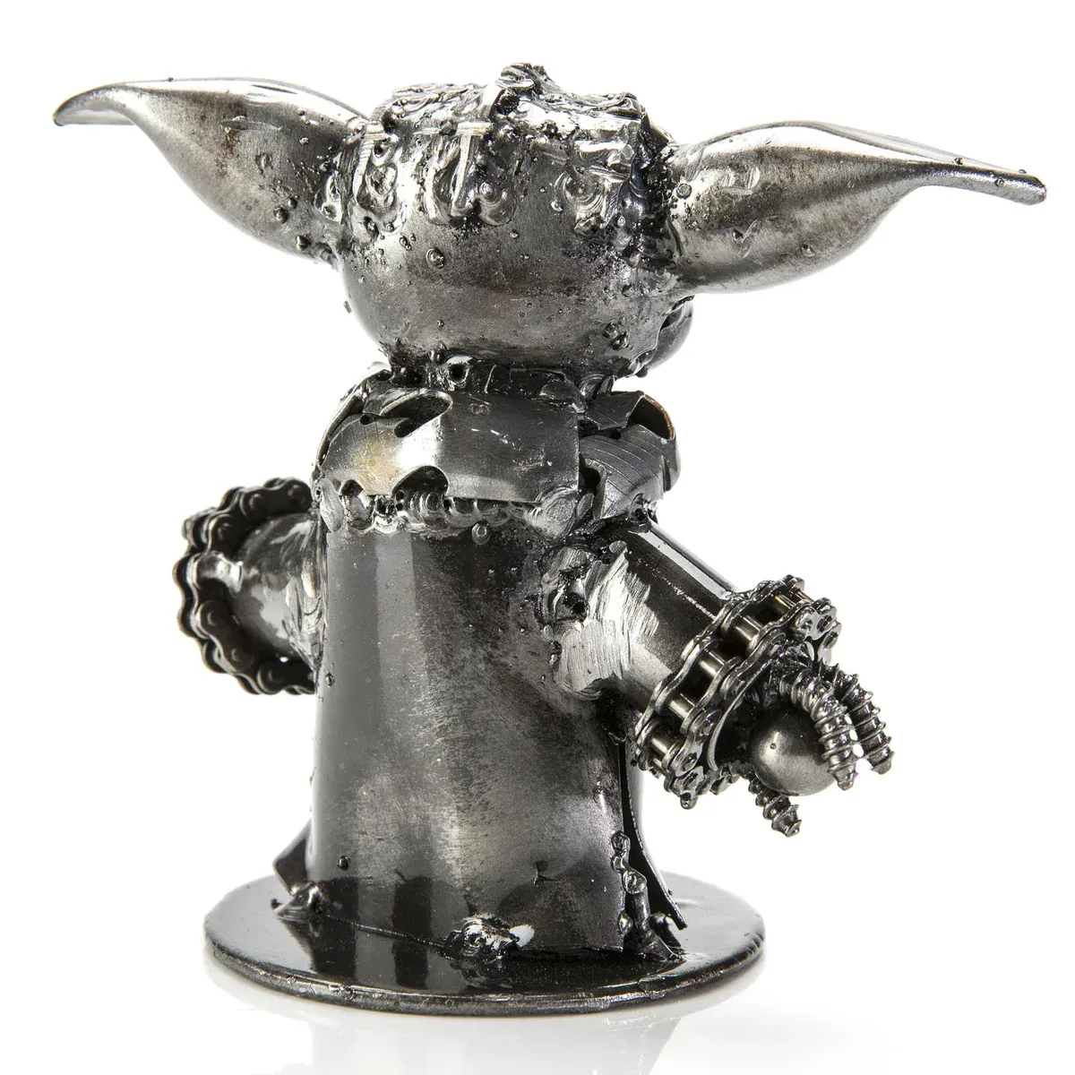 English: This Baby Yoda-inspired sculpture from Metal Art is an original, hand-made piece crafted from scrap metal and carefully fused with welds. Ideal for home, office, or bookshelf display, it also makes a unique and thoughtful gift. Each piece is one-of-a-kind, so slight variations in details and welds may occur.