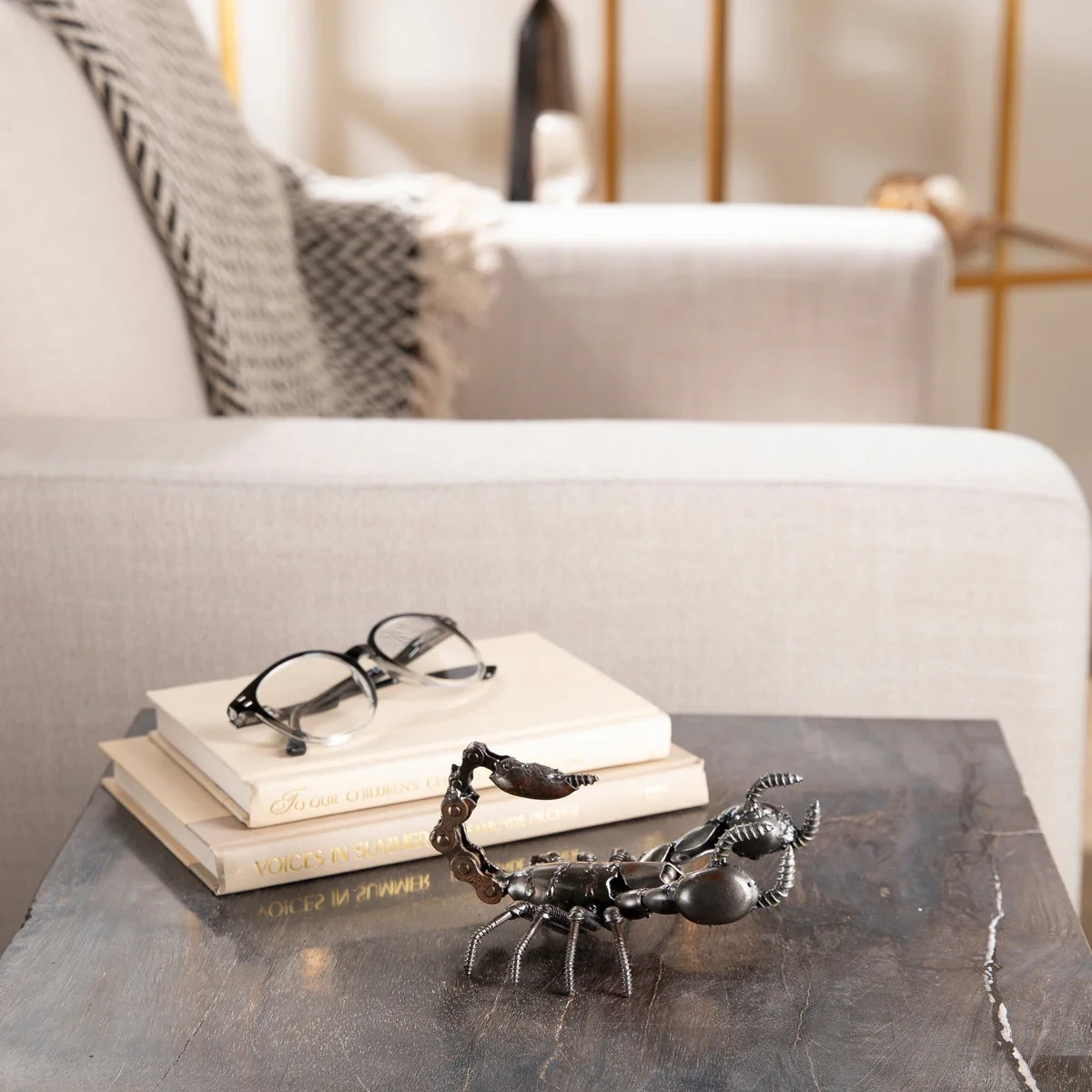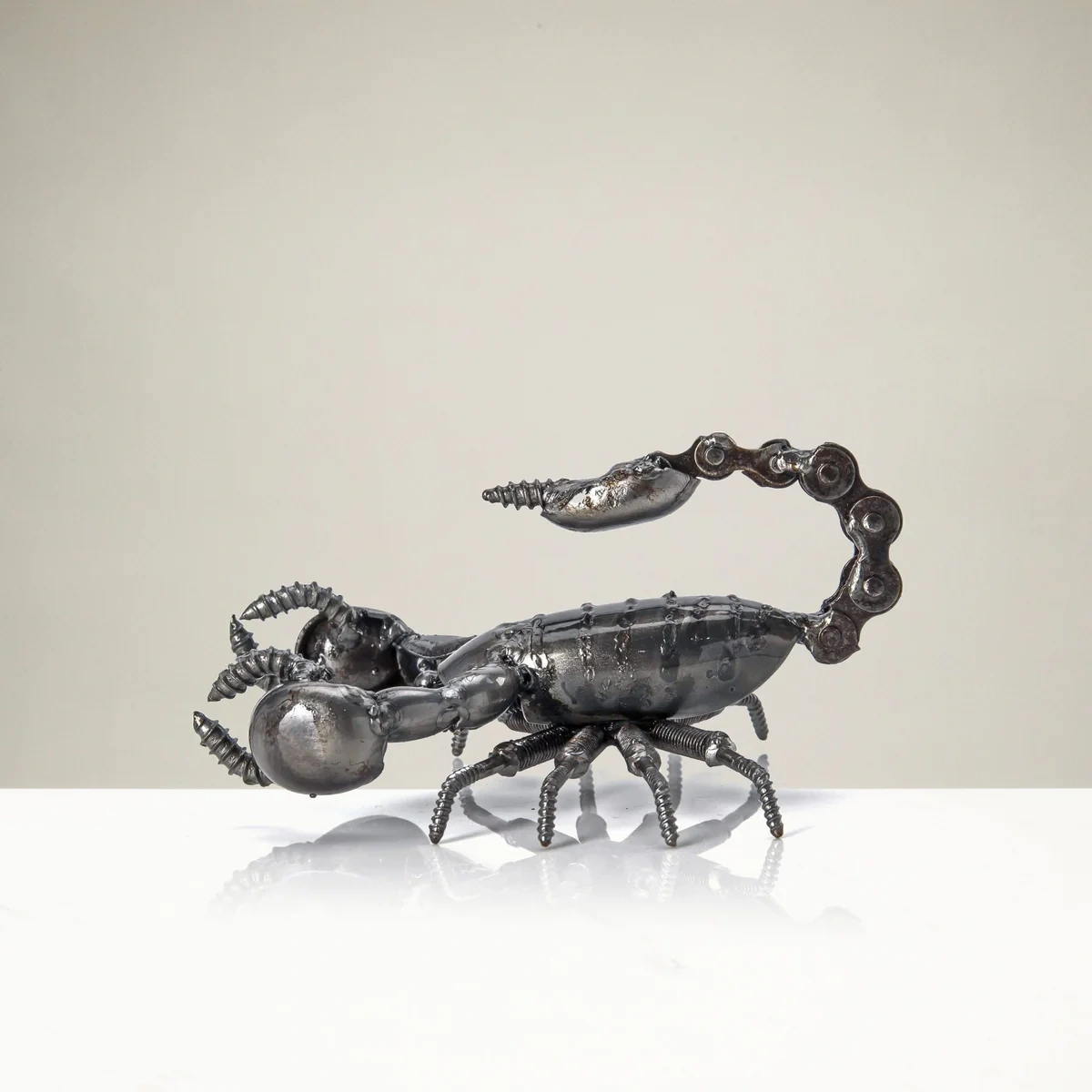 English: The Scorpion Inspired Recycled Metal Art Sculpture from Metal Art is an original, hand-made creation crafted from 40 scrap metal parts and fused with 95 precise welds. Each piece is one-of-a-kind, making it a unique décor addition for your home, office, or bookshelf. It also makes a thoughtful and creative gift for your loved ones. Please note: slight variations in welds and details add to the authenticity of every sculpture.